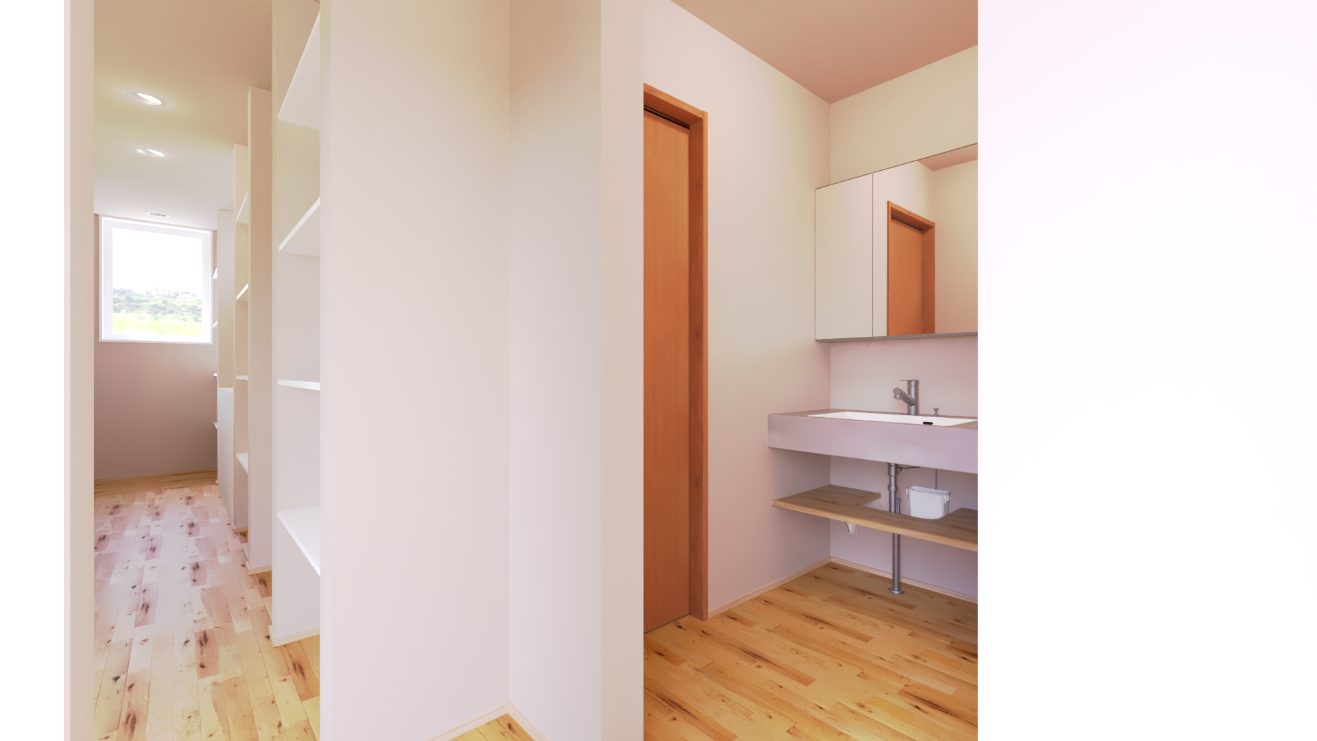 水回りは西側にまとめており、頻繁に利用するものを収納するFCL1をランドリールームと洗面スペースの間に計画しています。