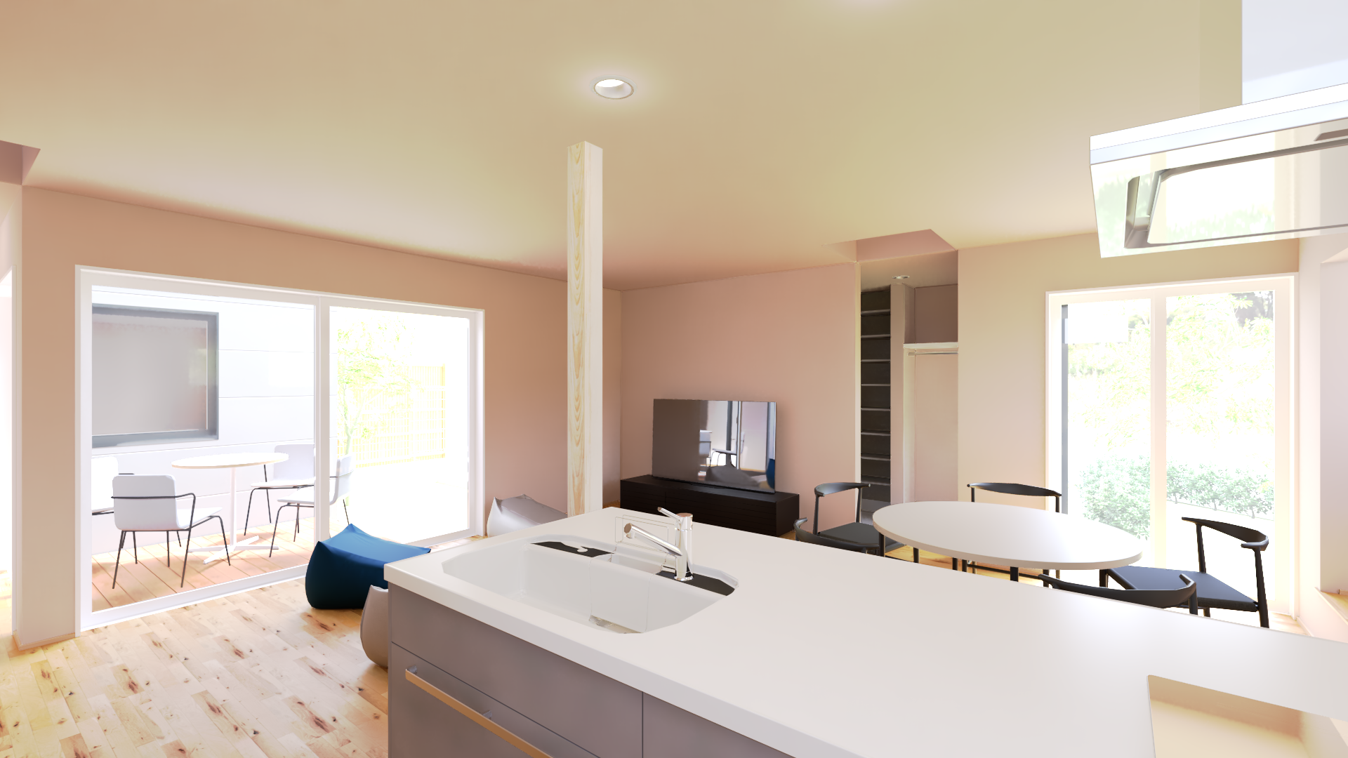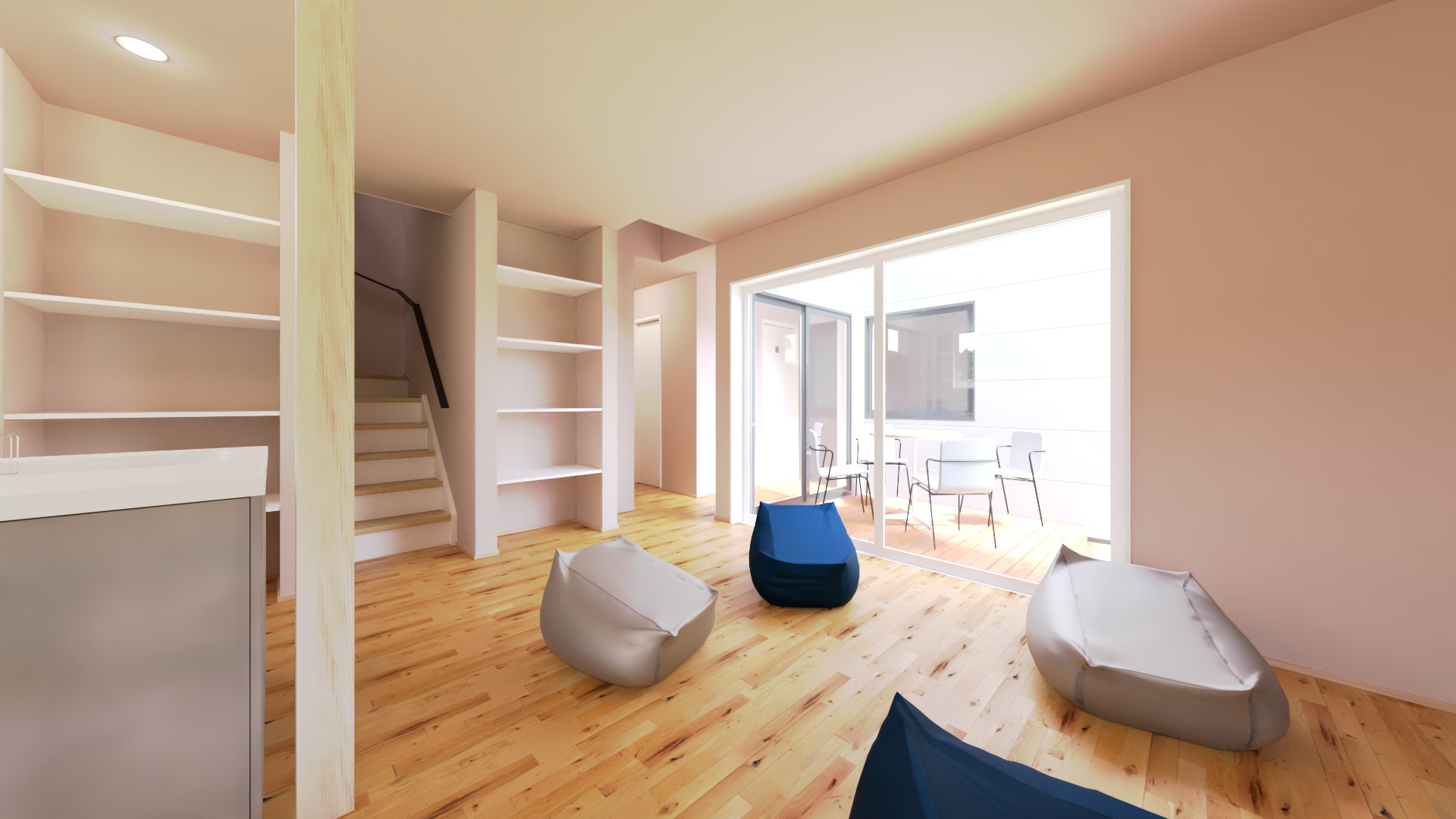基本テレワークスタイルのご主人のためのワークスペースは、独立した空間でありつつ、息が詰まらない空間とするため、できるだけ離れた場所になるように配置を考えています。