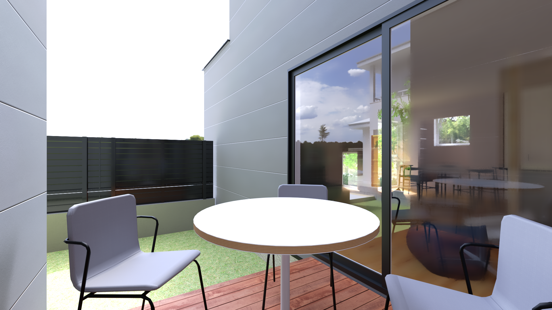 北庭はLDKやワークスペースにコの字に囲まれた屋外空間で、北側や西側からの視線を遮りつつ、東側道路からは駐車スペースの奥にさらに距離を取っており、よりプライベートな庭として使用できるようになります。