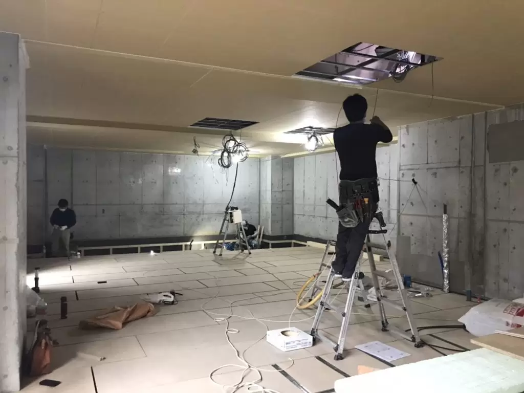 この日は職人さん達が電気や水道の仕込みをして下さっていました。