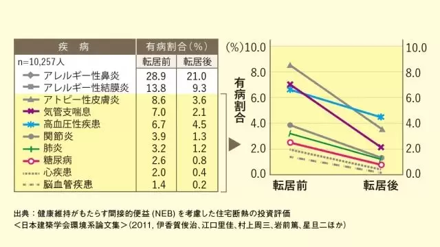 「断熱性能の高い家に転居後の有病率の低下」を示した画像(下図)を見せ、
