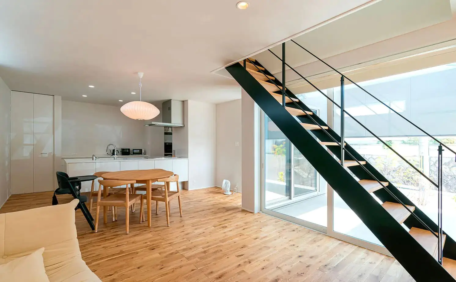 光や空などの自然を感じられる明るい住まいが施主のご要望。吹き抜けにある大きな窓からは、リビング全体に光が届けられます。また、2階に浴室やランドリールームなどのプライベート空間を集約することで、1階をきれいに保ちやすくなっています。