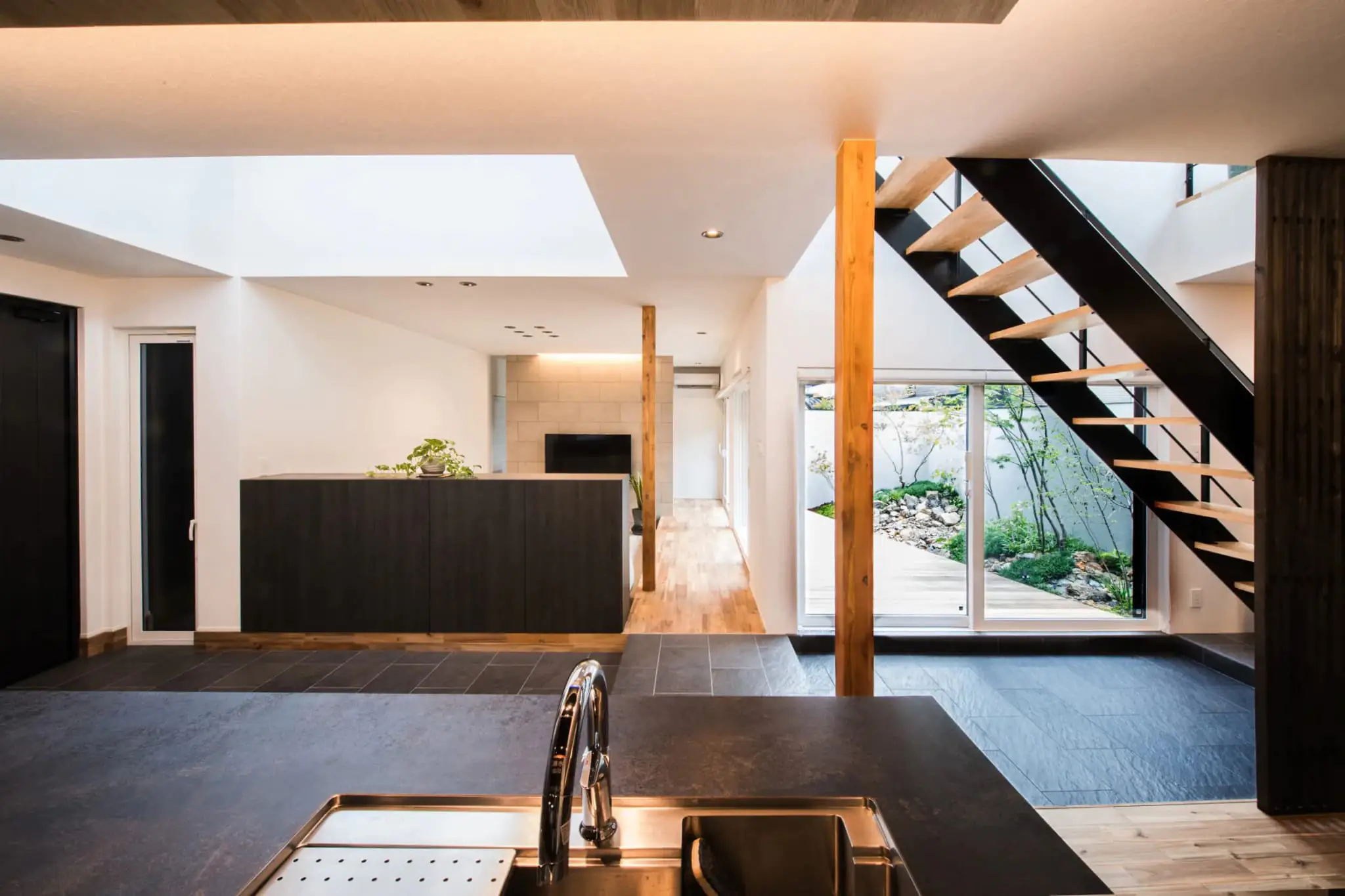 玄関土間を中心に広がるLDKが斬新な、和モダンの住宅です。インナーガレージやオープンなキッチンなどの理想を詰め込みました。断熱性能も高く、友人が集えるような広い空間でありながら、エアコン1台で快適に過ごせます。