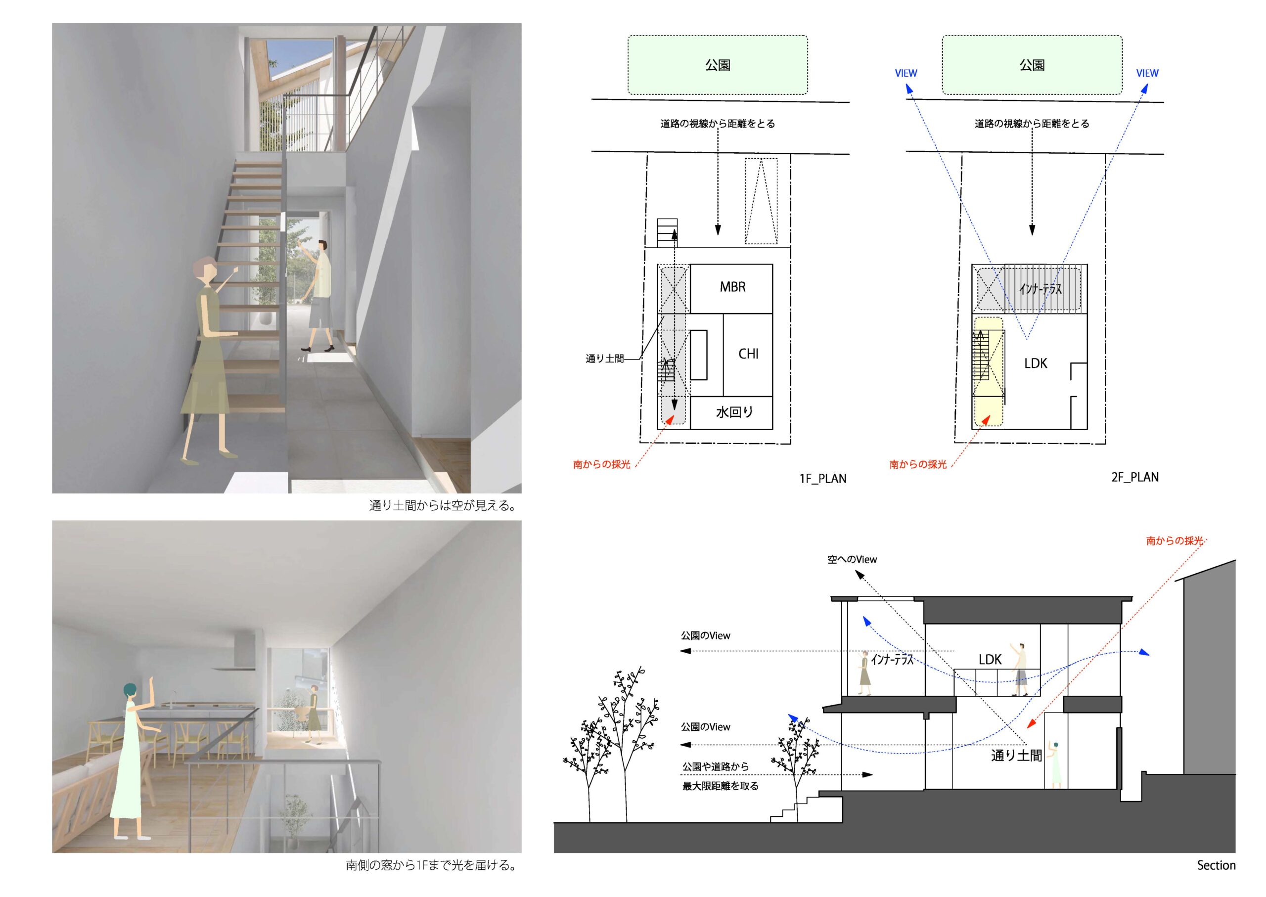北側に土間や前庭・インナーテラスを設け、道路や公園からの視線を遮りながら豊かな景色のみを取り込む。